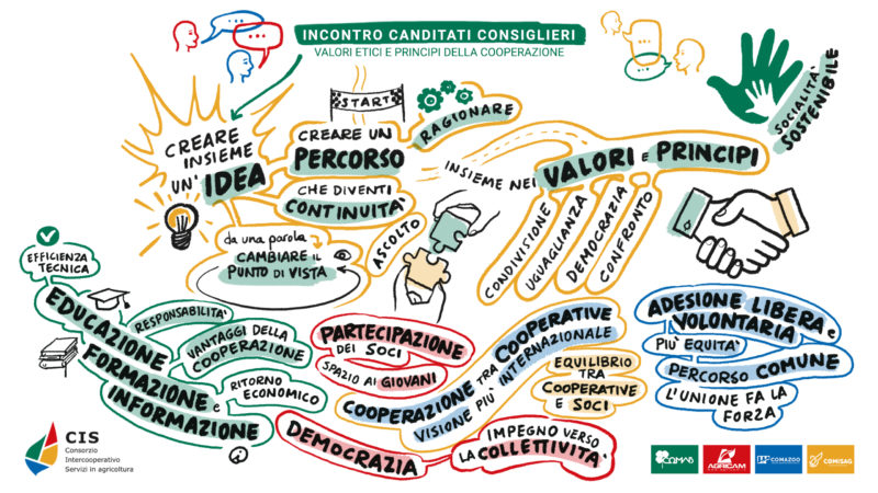 I paracarri, cioè le regole e i valori che ispireranno il percorso dei futuri amministratori, sono ben evidenziate dal disegno realizzato durante uno dei tre incontri. Disegno che vi invito a guardare con attenzione, per poi percorrere con la mente il percorso… a ognuno di noi il compito di focalizzare il tema che maggiormente interessa senza perdere la visione d’insieme.